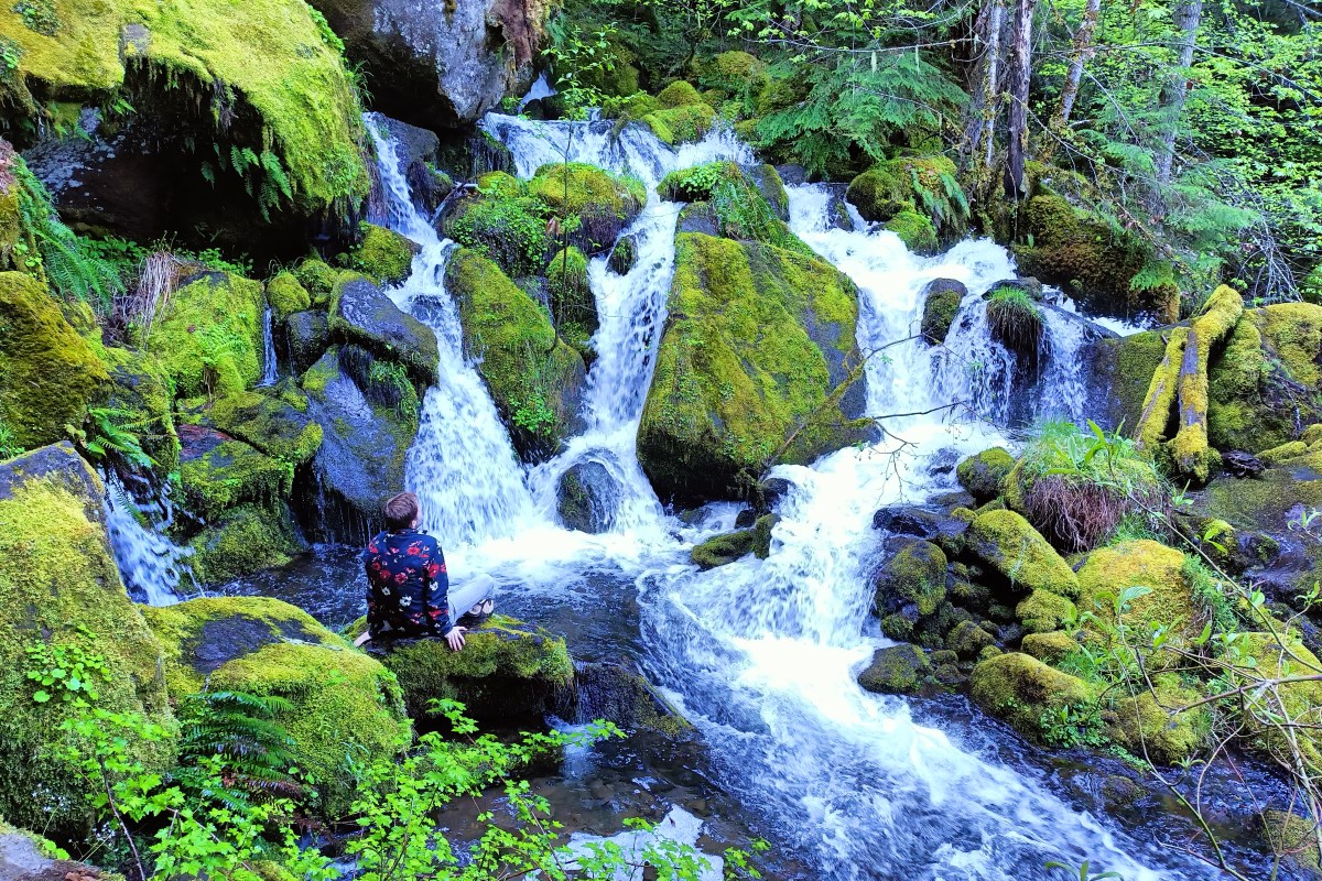 The Rogue-Umpqua Highway is home to the third tallest Falls in the State of Oregon, Watson Falls. Nature’s cries bawl down 272 feet of endless tears in this towering beauty, pounding aggressively into the pools below and granting an illusion of rain amid a sunny day. The impact soaks any approaching visitor before they even reach its base, challenging photographers with damp lenses but waking up overnight boondockers testing new air mattresses that seemed to randomly deflate and interrupt their slumber (this trip served as a trial run for my vehicle’s ability to support potential long-term living, and clearly revealed some needed adjustments). Watson Falls is the first time I met another adventurer that day, allowing for picture-taking trades; she snapped a few on my own, I snapped a few on hers. I brought a tri-pod, but its inflexible legs limited the positions and angles I could take pictures of myself, without assistance, and without the entire contraption tipping over. The presence of this second visitor thus proved a savior. Between all the falls I visited that day, I spent the most time here. On my way out, I found an alternative path leading higher up the cliff for a dryer viewpoint of the falls, allowing for a peaceful Falls-gazing experience without taking collateral damage.