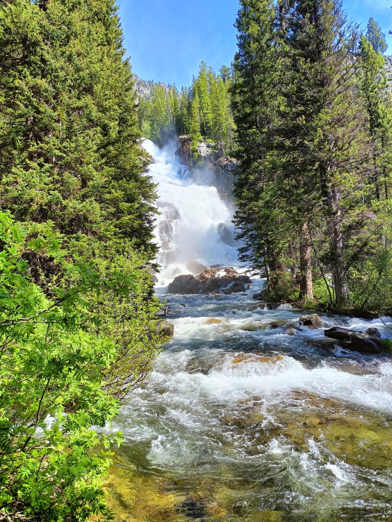 Since Saturday would be the only full day in the park, it seemed the optimal day for one of the park’s many long hikes available. I knew at least three of my friends were going to attempt a journey through the Cascade Canyon, so it seemed fitting to guide the rest around the beginning of that trek, around the popular Hidden Falls and Inspiration Point. Although I have already been to both, I would have felt bad not permitting the first time visitors to experience the same wonders that made me fall in love with the park. There were benefits to revisiting these points of interest anyway. My visit last time near the end of the season meant a weakened waterfall, so witnessing the Hidden Falls at the peak of its impact force offered a change in that experience for me. Both visits were memorable: the first allowed me a closer approach to the falls for photogenic views, the second’s forceful torrent announced its presence miles before its location and claimed dominance over the entire cascade canyon.