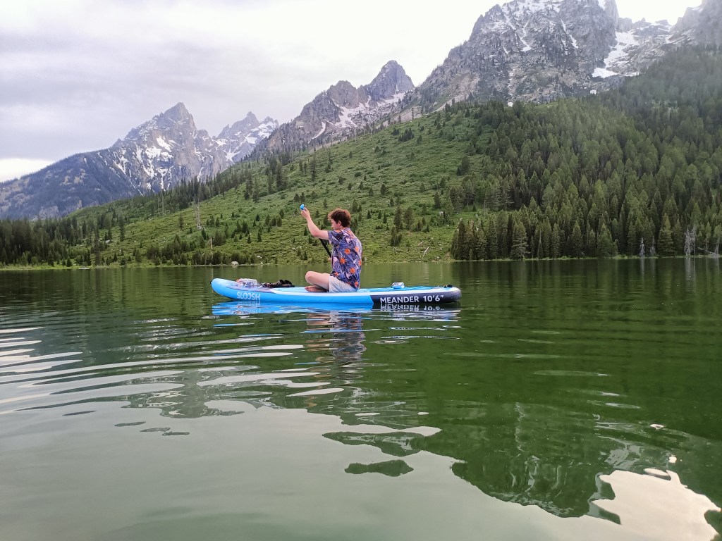 We waved farewell to Jackson as we returned to the campsite. The brief return’s primary purpose was a regathering in case any others wanted to join for an evening in the water. Only my passengers opted for this excursion, however, and once changed into their swimwear, we were off again once more. The driving around the Tetons this weekend wasn’t particularly efficient, lots of back and forth that could have possibly been avoided with better foresight, a flaw to be perfected for future visits. My main interest in the lake day was the discovery of renting a boat during my initial visit which, despite my pre-trip research claiming it was only available as first-come first-serve, apparently required reservations. Thankfully I had a back up plan, a brand new paddle board purchased and delivered only a day before leaving home. As the only paddleboarder in our group that evening, I was more or less able to evade the chill temps of String Lake, a lake we were informed was among the warmest in the park due to its shallow waters. I would have preferred the water temps over the mosquito infestation any day though. These conditions weren’t ideal for any of us though and as soon as the others felt ready to return, I obliged. I knew most planned an early departure in the morning anyway and I’d have time to return and fully explore the lake the next day.