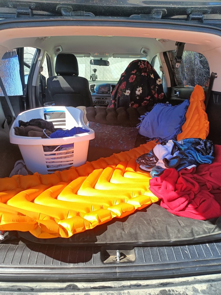 The camping pad came with its own list of flaws however. Firstly, it’s too long to fit firmly in my Kia Sportage, making for some repositioning throughout the night. Luckily, I have watched several videos already on others modifying their similar vehicles to adjust this challenge accordingly. I lifted half of my back seat to rearrange my gear and allow the folding of my passenger seat only to discover the seat does not fold. I realized my other option is to remove the seat entirely, but that is a video I have not yet seen and more a better plan for long-term nomads anyway and I hadn’t yet decided for how long I’d adopt this lifestyle. Ultimately, however, I do feel the camping pad is efficiently superior to the vehicle-wide air mattress. In my personal opinion however, if you have an interest in the set up, steer away from inflatables. If at any point in the future I return to this lifestyle long term, I’d much rather install a small mattress.